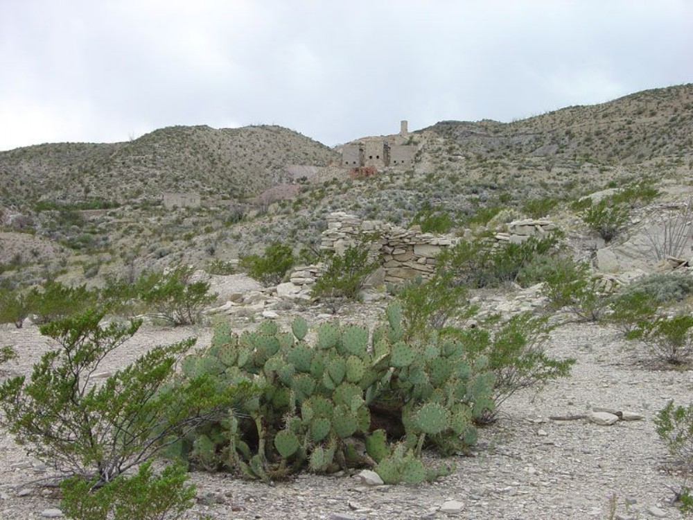 Creosote bush and prickly pear cactus grow amongst the ruins of the old mine buildings of the Mariscal Mine. The mercury mine was active in the early 20th Century. It is located along the River Road in southern Big Bend National Park.