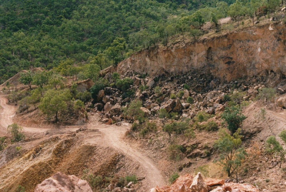 A view down into the 'old open cut' which was actually a collapsed room and pillar operation dating back to the early 20th Century, north side of the hill, 1986 - 1987.