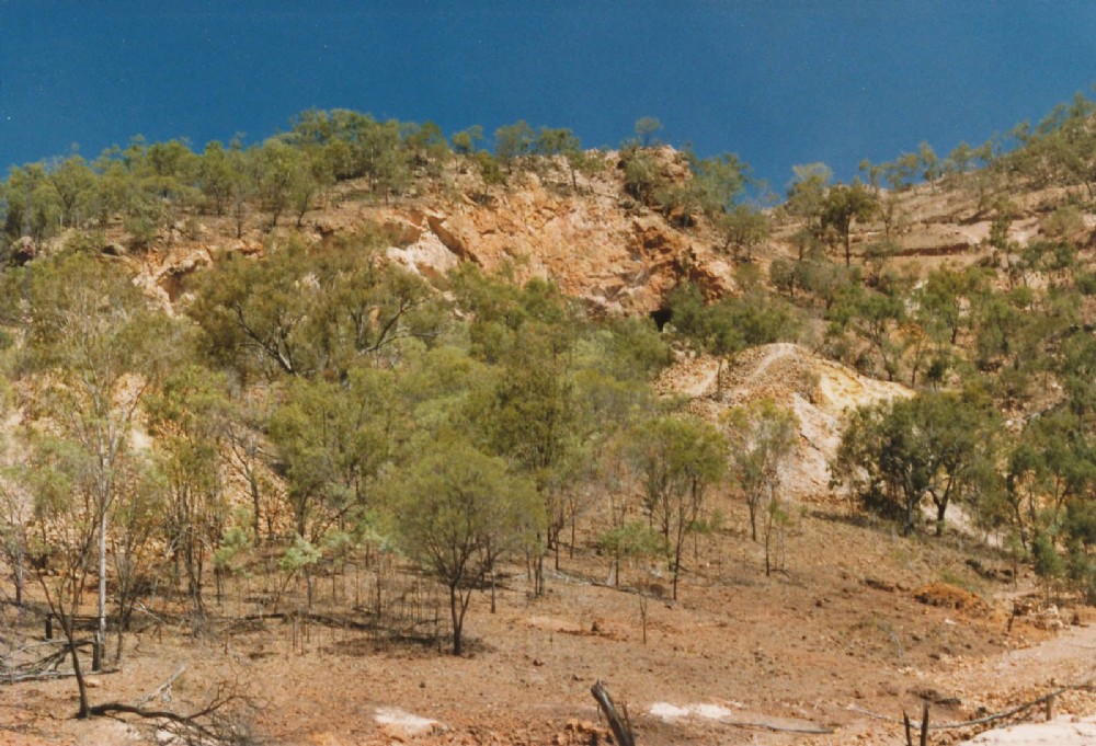 A view from the foot of the hill showing the old open cut and the main hill on the right ringed by exploration drill tracks, ca. 1987