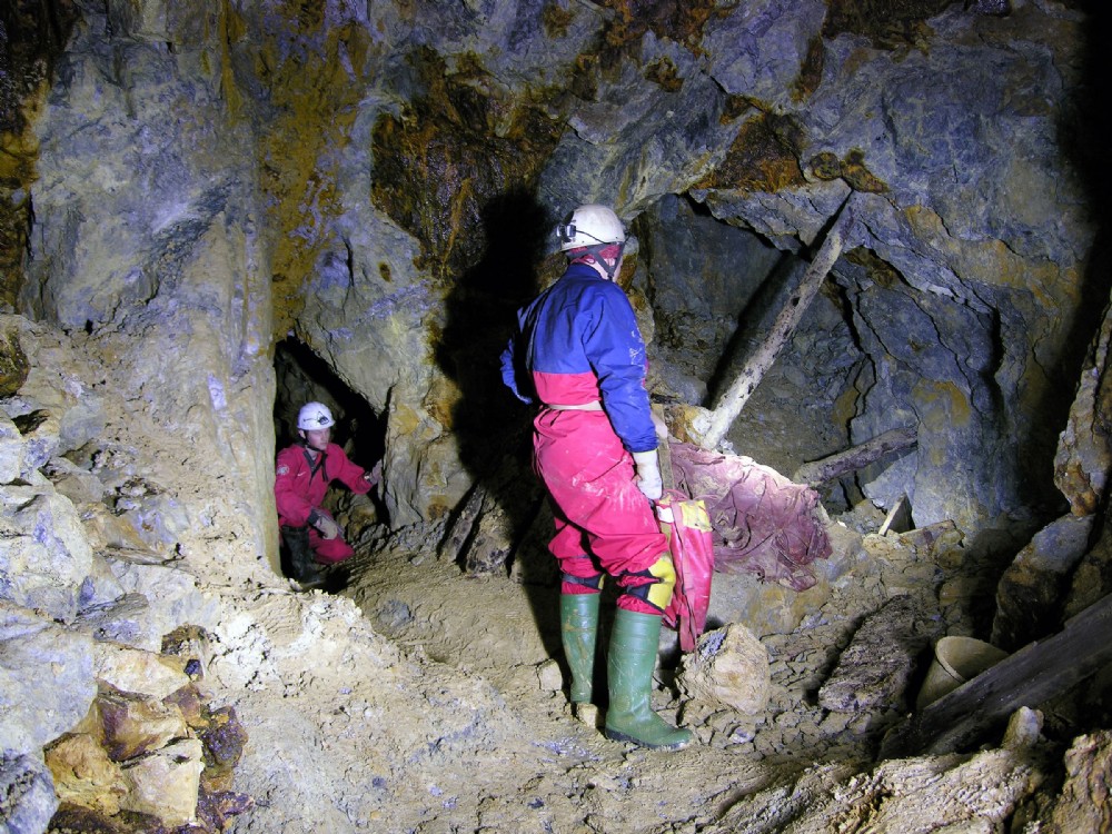 An opening in the passageway on the xx fathom level, Darkstar in the foreground, Mountainpenguin in the tunnel. To the rear right of the photograph is a vertical shaft.