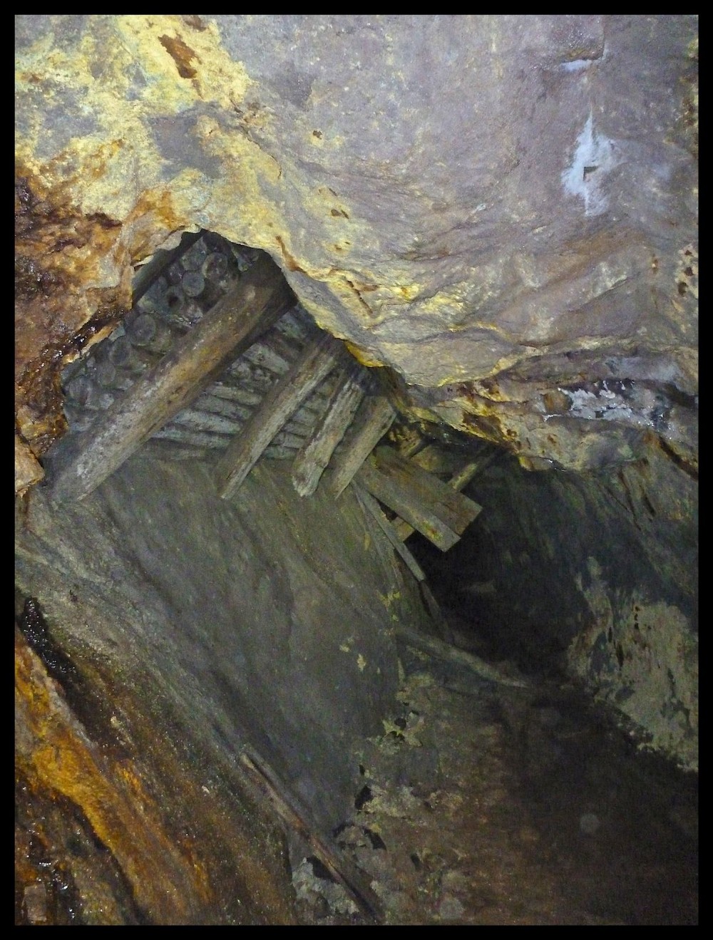 Slightly less intact ore chute with timbering.