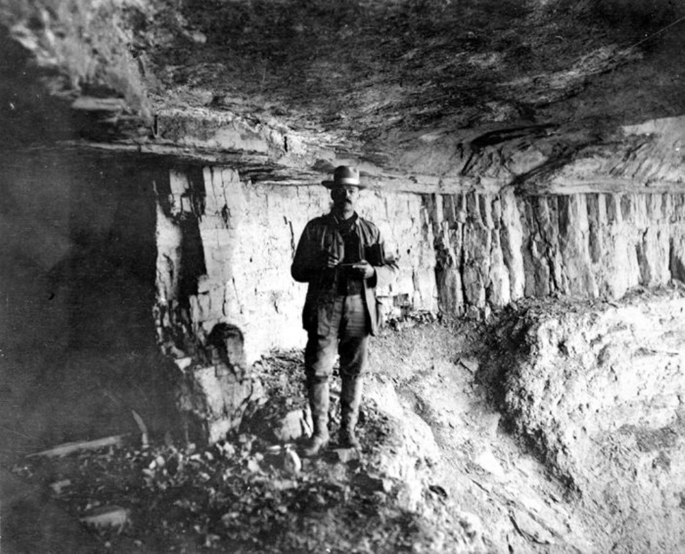 Outcrop of coal at entrance to Ballards Mine showing jointing of coal, M.R. Campbell provides scale.