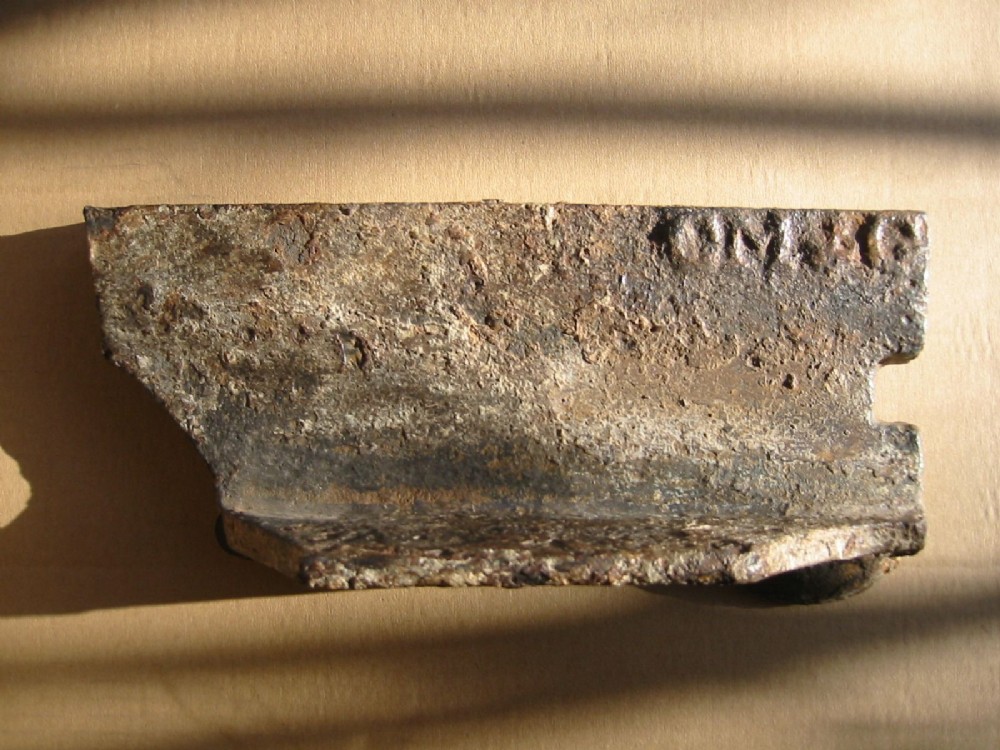 A broken fragment of an Outram gangrail cast at Butterley Furnace in about 1803 for use on the Croydon Merstham and Godstone Iron Railway. The letters CM&G are visible. Found in Godstone Quarries where some rails ended up and were used second hand until after 1900.