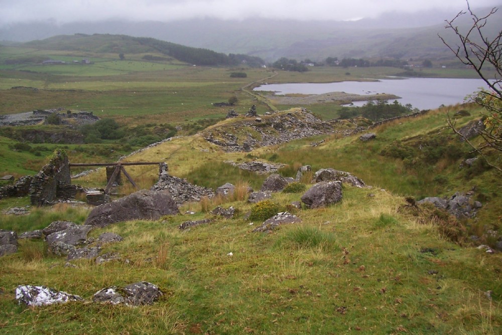 Looking down the site past the upper mill along the surviving tramway to the incline drumhouse near the end of the tip. The incomplete mill is lower down to the right of the photo, while the exit tramway to the Welsh Highland railway snakes away in the middle of the photo. Tips from the quarry also ventured into Llyn y Gadair itself. To the left of the photo is the Twll.