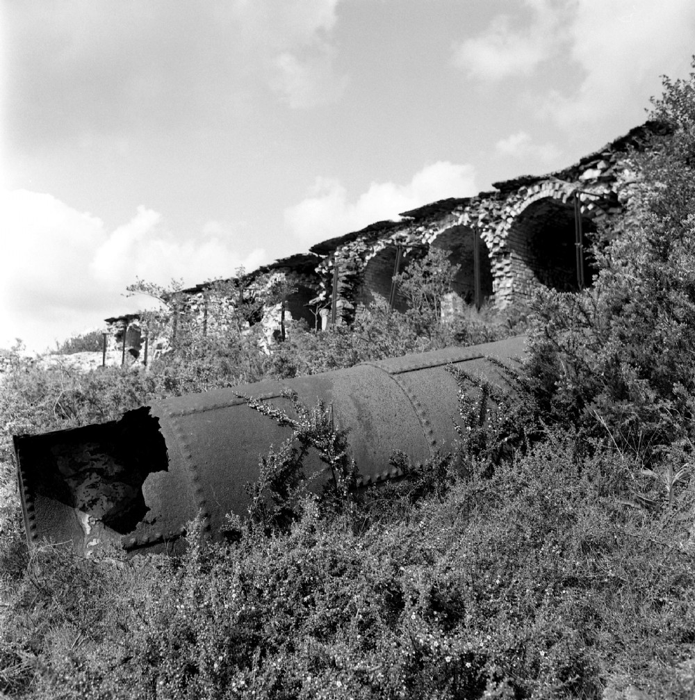 The large boiler-like object in the foreground is almost certainly the remains of an Oxland tube calciner. This was probably used in conjunction with the other, Brunton-type calciners during the final phase of working here.