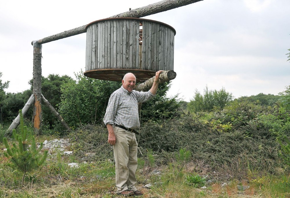 Paddy Geoghegan demonstrating the reconstructed horse gin on the site of the original gin (fragments of the old posts still survive in-situ) that worked the main hauling shaft (Whymme shaft).
