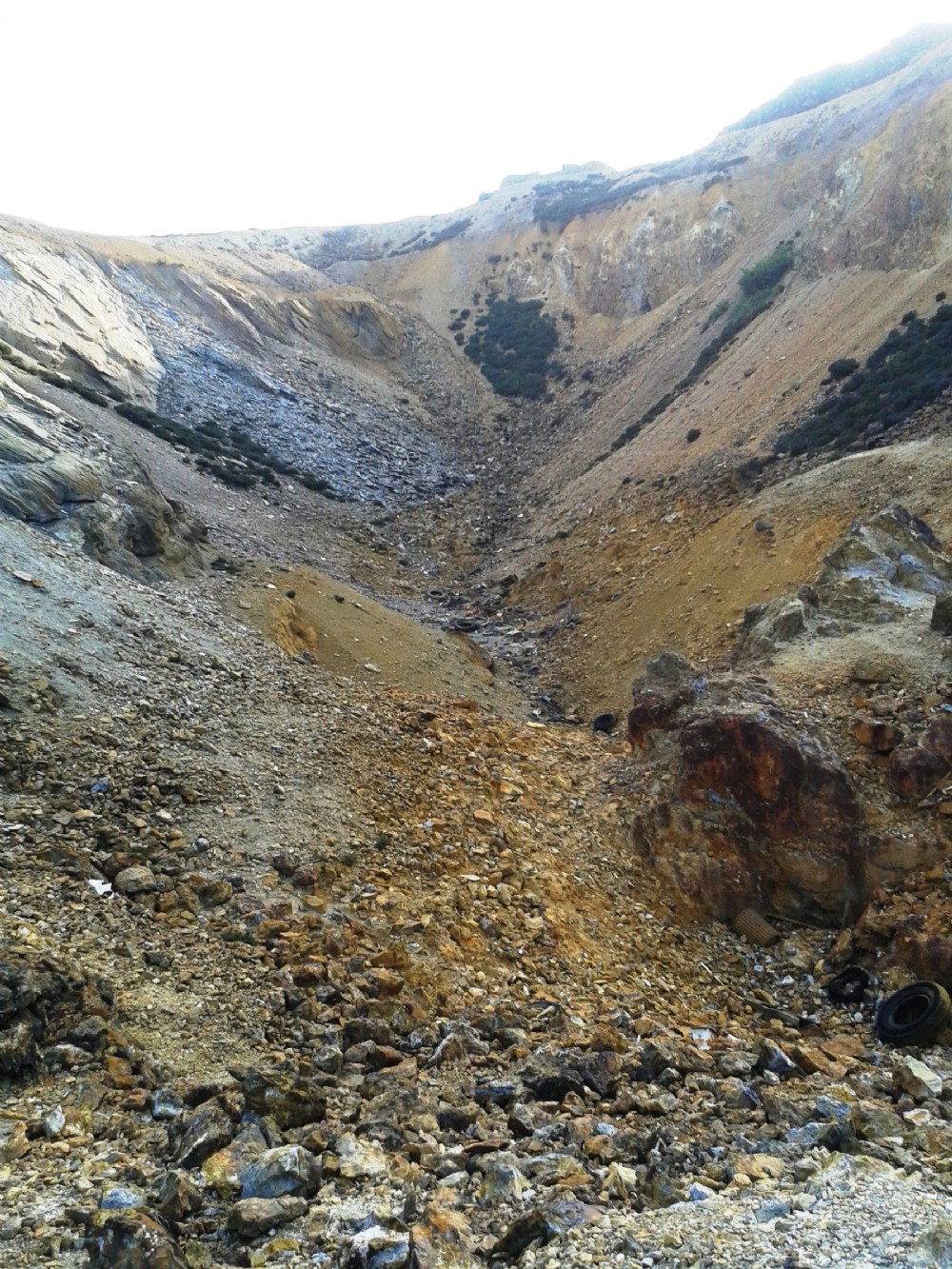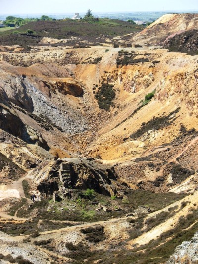 Mid looking SW. Visitor viewpoint at top of rim. Foreground was flooded with red, deep, acid water until the mine was drained in 2003. Many vehicles were dumped in the 'lake' - all that remains of them are the tyres and any plastic bits!