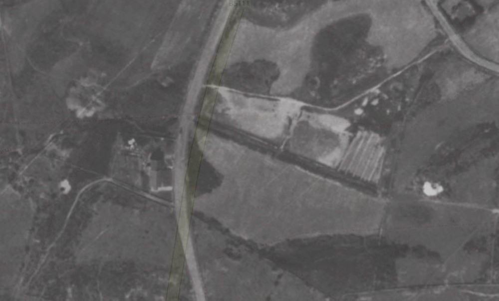 Aerial photo of Tan yr Allt area 1945. Note Garden shaft (left) and Siaft Wen (right) still clearly visible at that time. Also Pen y Nant and Chapel shafts.