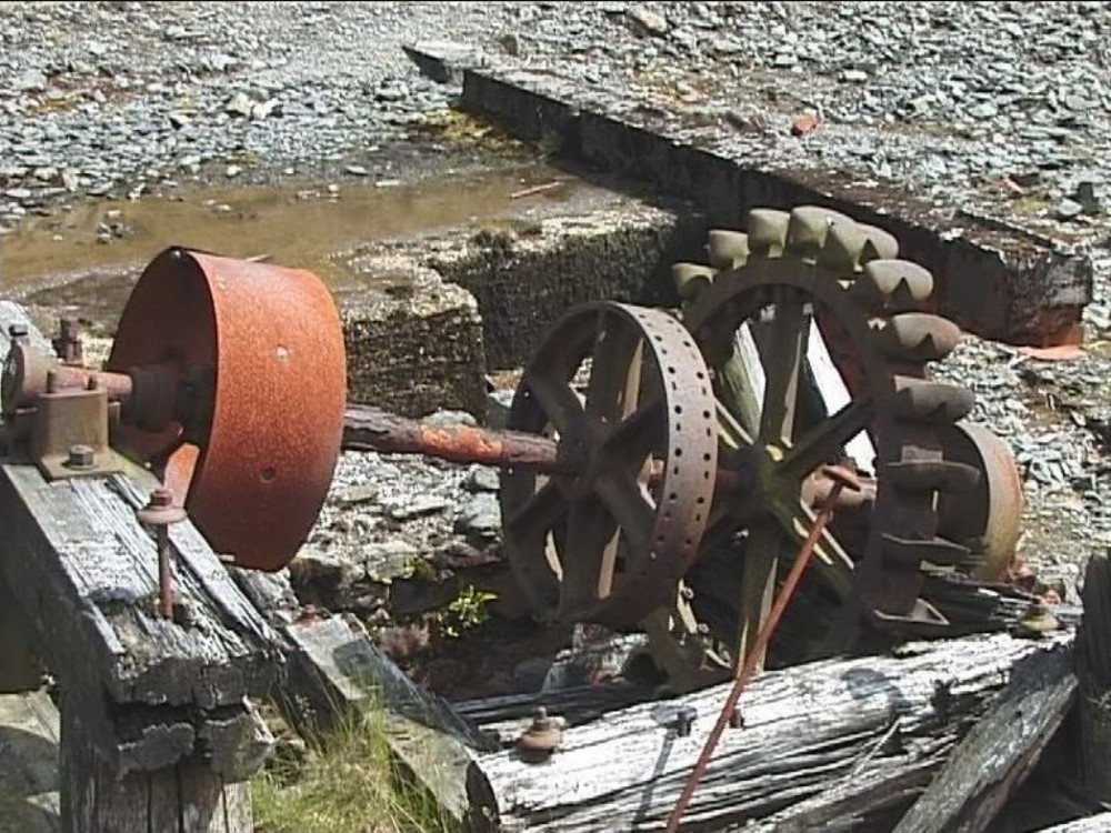 Pelton wheel, part of the remains of the c1900 water powered dressing floor equipment. [Grab from 12th July 2002 video]