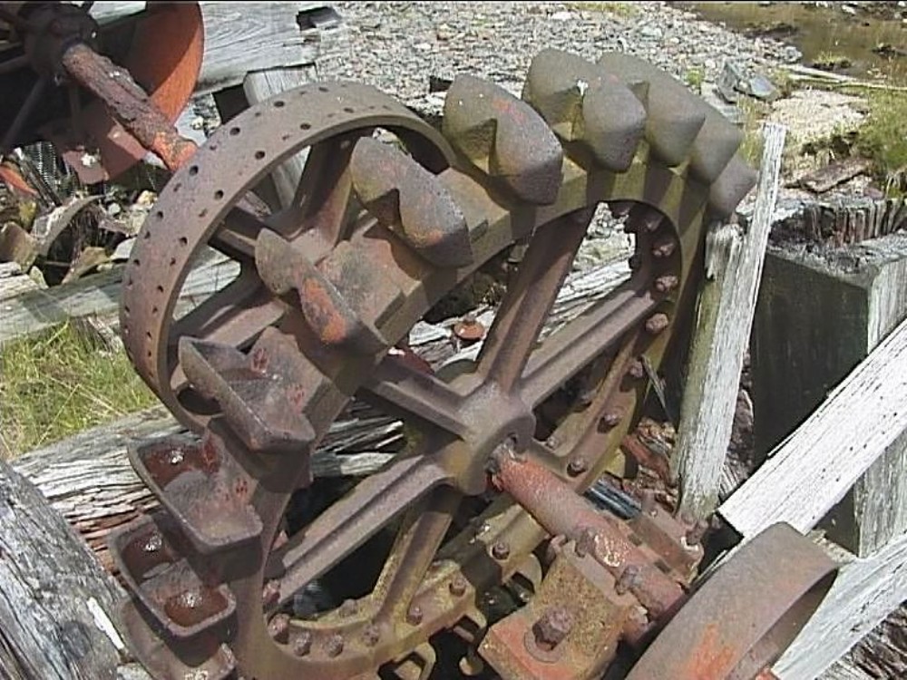 The pelton wheel, part of the remains of the c1900 water powered dressing floor equipment. [Grab from 12th July 2002 video]