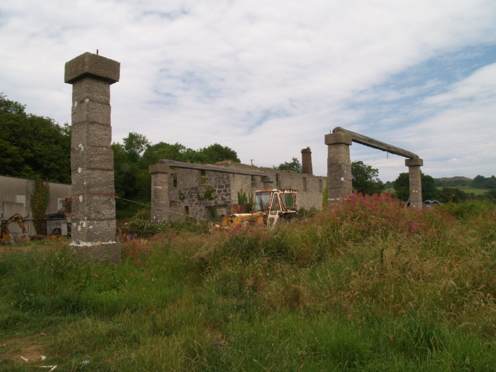 Mill/workshop building, with brick chimney, in background.