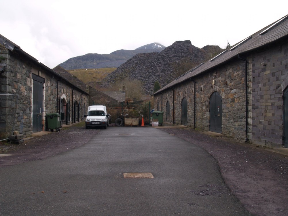 View looking S. The water wheel is between the buildings, to the right of the white van.
