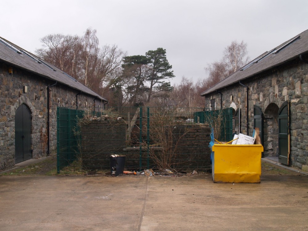 View looking N. of the yard and the buildings of the slab mills. The enclosure between them contains the water wheel. Built in 1866, some are now in re-use by small, light industry.