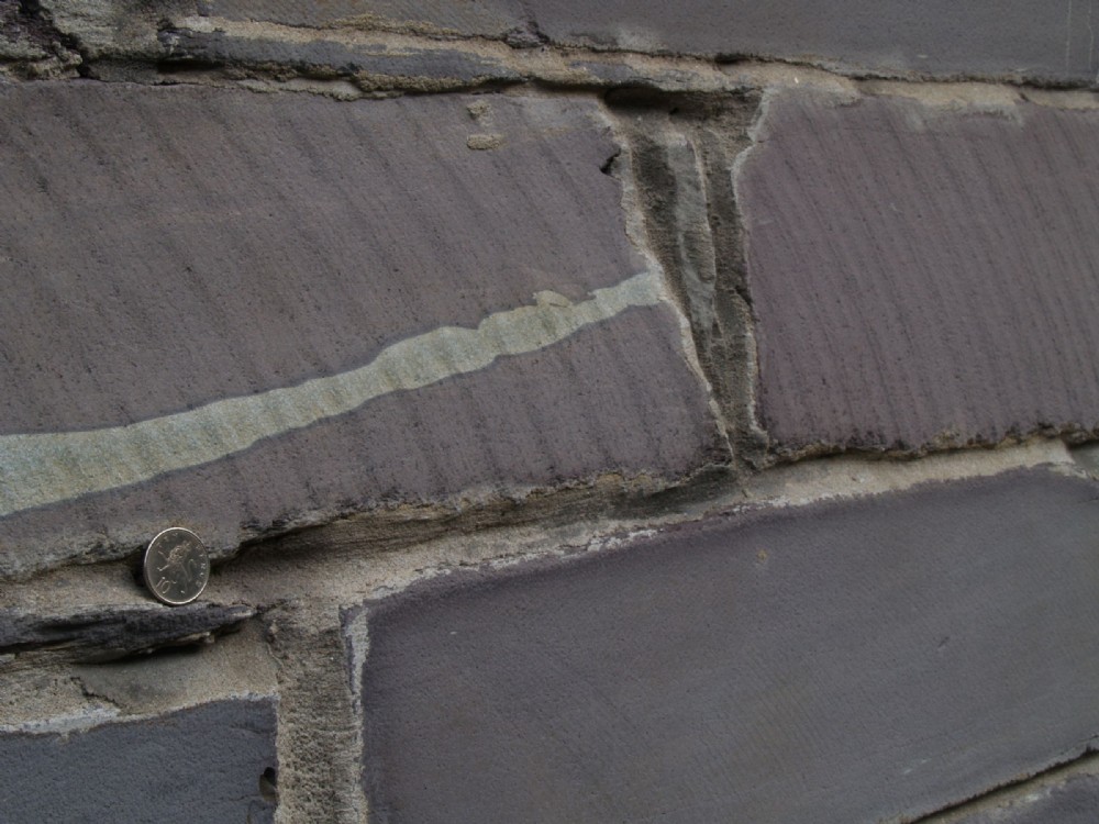 Saw marks on cut slate block.