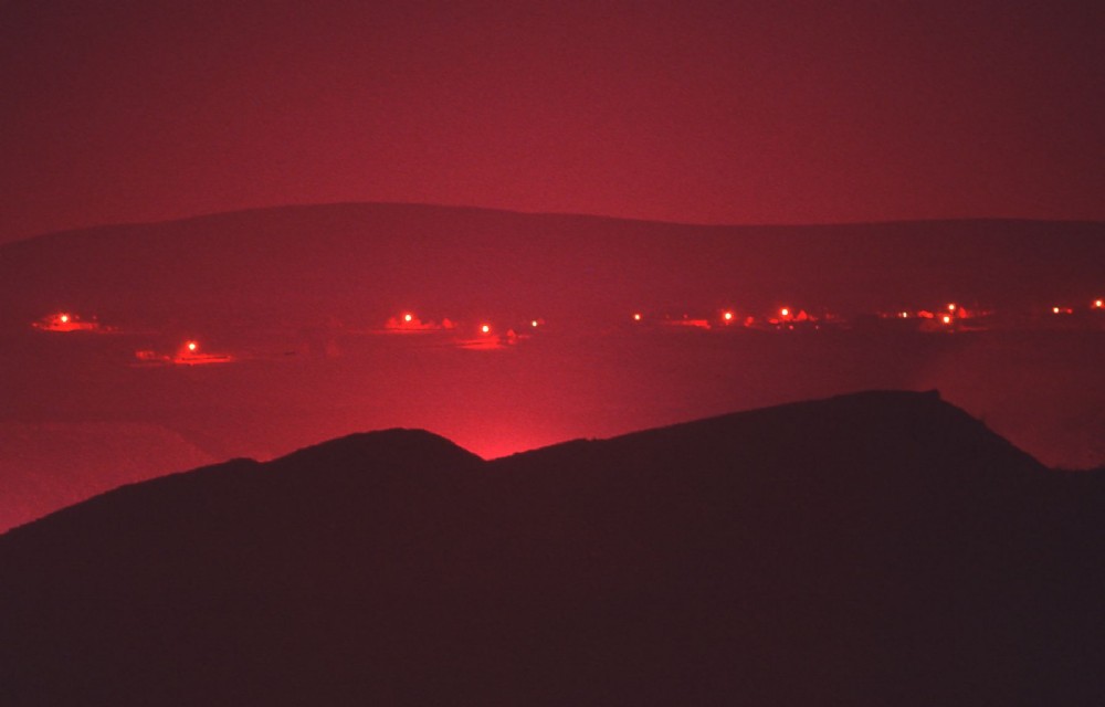 Night. Light. The glow from behind the tips is the mills and crusher plant.