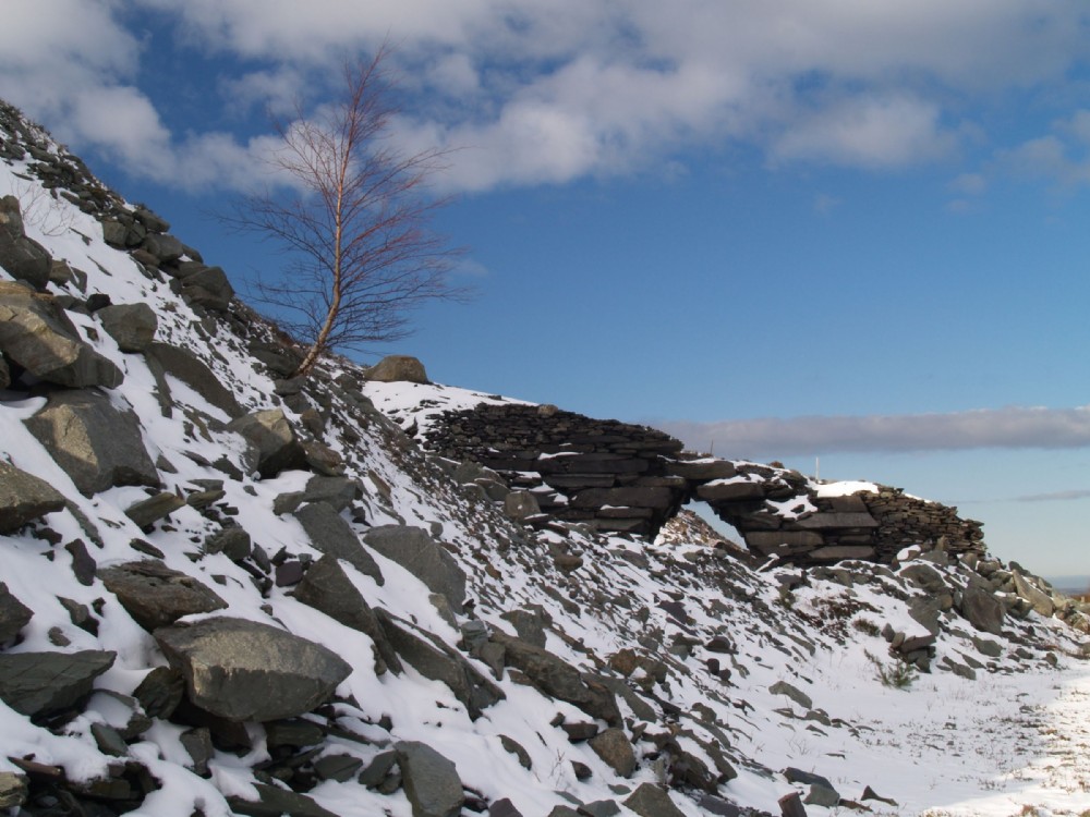 Landscape detail. Remains of incline and archway. Waste slate and overburden rock. Tree. Snow.