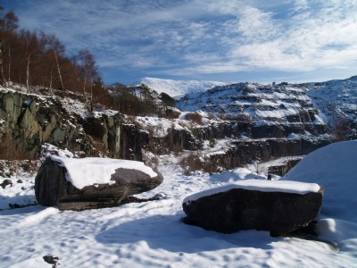 Landscape view of old caban on tips on S. of quarry. Looking SW. at the Carneddau. 4.2.09.