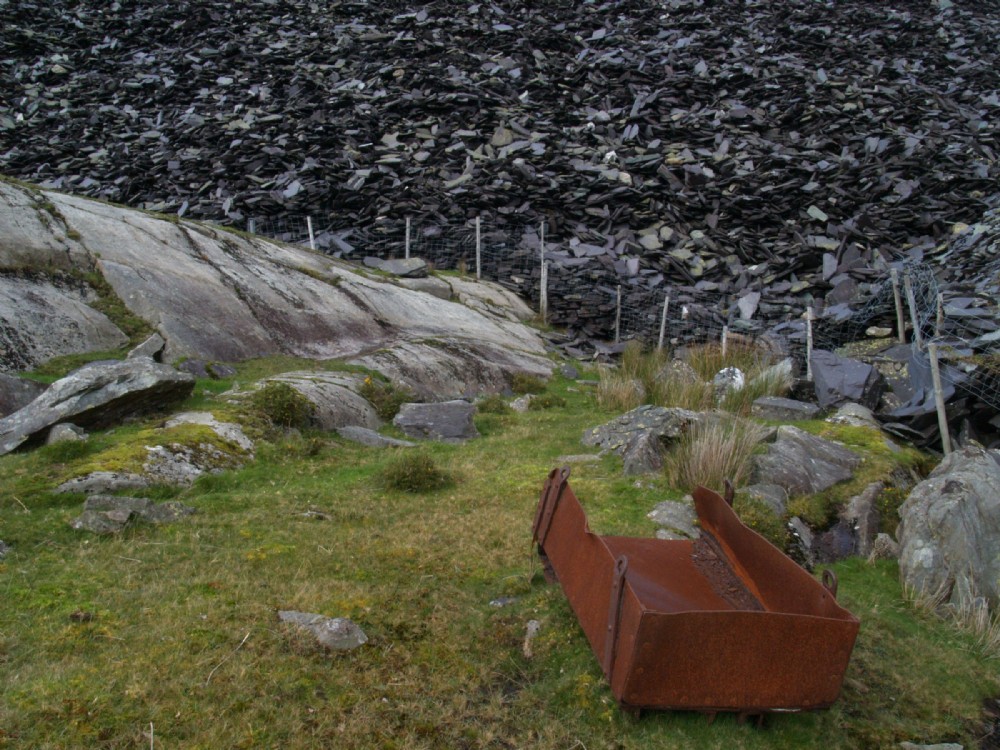 Landscape detail. Conjunction of tipped slate with glaciated, bed rock. Blondyn (tipping truck?) truck at bottom of tip. Extant, Summer. 2007.
