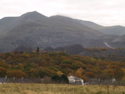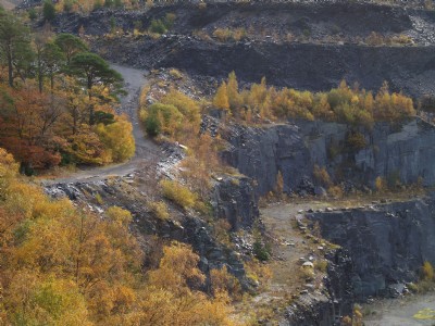Landscape detail of East side with flooded pit. Taken from drive to quarry, Autumn, 2007. CF. images in archive album. The water in the flooded pit really is this colour. Trees. Terracing.