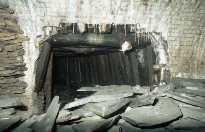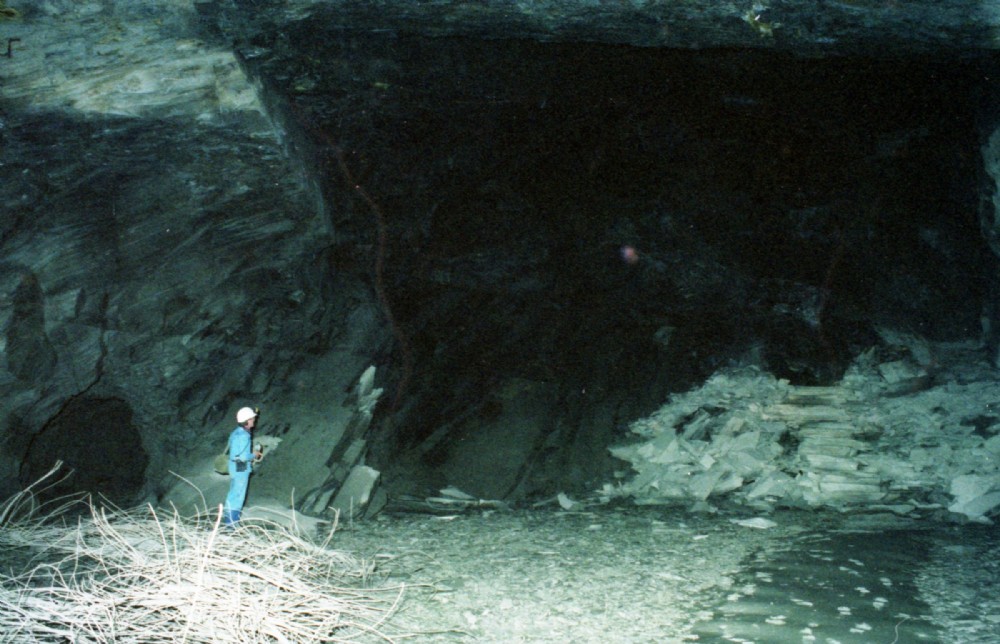 Chamber B8 New Vein, nothing to do with long worked away floor B, but a nomenclature used for chambers east of Chamber No. 1 To Wil's left is the level to chamber B9, while the steps on the right lead up to a strange level which crossed over the top of the Floor G Drainage Adit "Lefel Dwr" and gained access to some other New vein chambers on the other side.