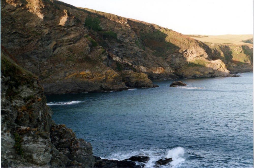 The sill that was worked for Pentewan stone is visible here in the cliffs as the pale coloured band rising gently toward the camera.