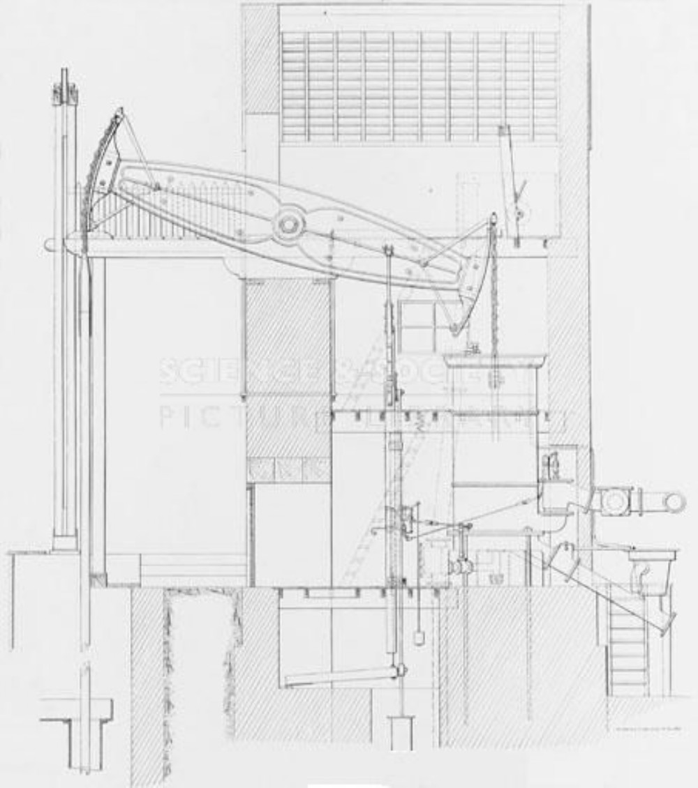 Technical drawing by Clarence O Becker showing the side elevation of an atmospheric engine at Pentrich Colliery, Derbyshire, based on a design by Thomas Newcomen (1663-1729). Newcomen designed an atmospheric or 'steam' engine in 1712. It was safer and more effective than the earlier Savery engine and was widely used to drain water out of mines. This drawing shows an engine, built by the engine-wright Francis Thompson (1741-1809), at the Oakerthorpe Colliery in Derbyshire which had a working life of 127 years. In 1841 it was re-erected at Pentrich Colliery, near Ripley, where it worked until 1918.