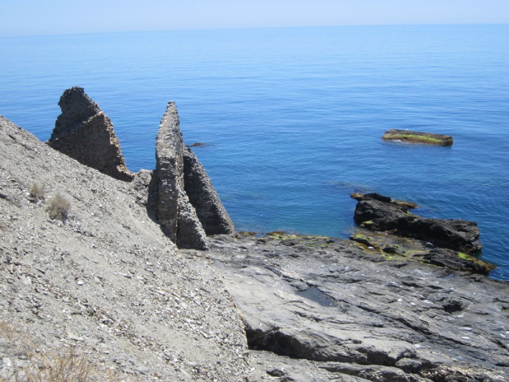 Remains of the 2 supports for the cantilevered loading pier with ruined administrative buildings on the left
