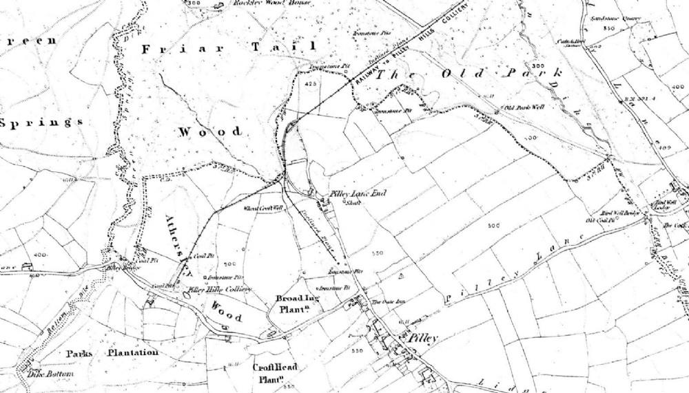 OS map extract showing Pilley Hills Colliery and its tramway in 1850. The tramway also served iron pits at Pilley.