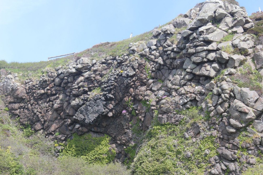An interesting exposure of pillow lava in the 'dry' quarry. This was formed by lava being extruded on the sea floor and rapidly cooled by the sea water. Probably of Tertiary age.