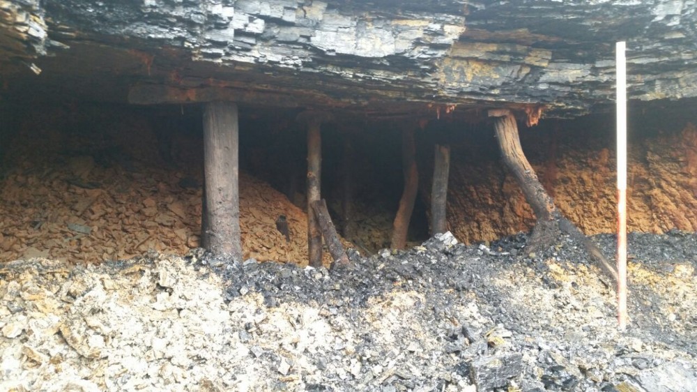 Pit props made of sawn branches/ small trunks (at least one was oak) within a gallery close to Ellen Pit. A waggonway associated with the shaft of Ellen Pit was constructed over several in-filled shafts and galleries, so this gallery possibly pre-dates the pit, which was not shown on the 1850s Ordnance Survey map, but was 'old coal pit' and 'old shafts' on the 1890s revision. The gallery was exposed during modern excavations