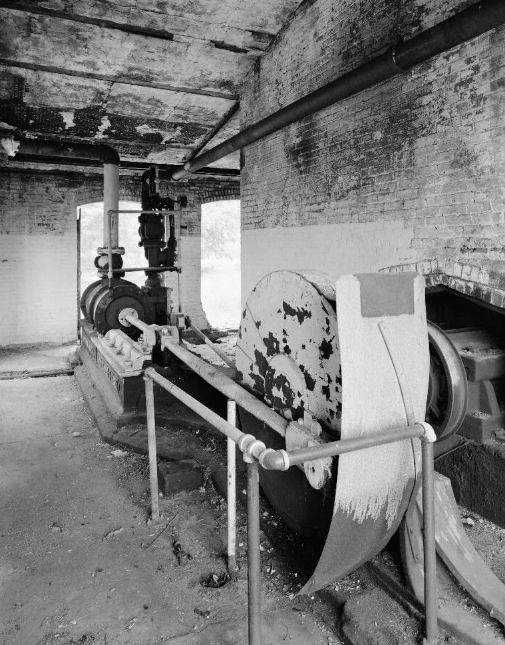 INTERIOR VIEW OF HILLMAN FAN HOUSE ENGINE ROOM LOOKING EAST This overview of the 1883 Pittston Engine and Machine Company steam engine includes the flywheel and pillowblock in the foreground, with the shaft and cylinder in the background. The engine is a horizontal, slide valve type of 30 inch bore and 60 inch stroke that turned the fan at 49 revolutions per minute.