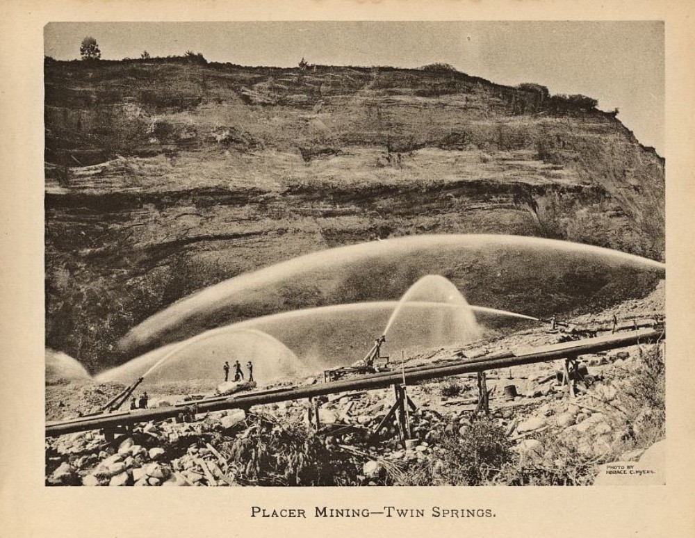 Photograph showing men using jets of water to loosen soil while placer mining for gold.