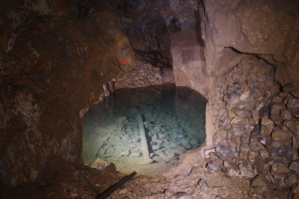 om a wet day with the plank under water. flooded stope on rhs leads to the show cave