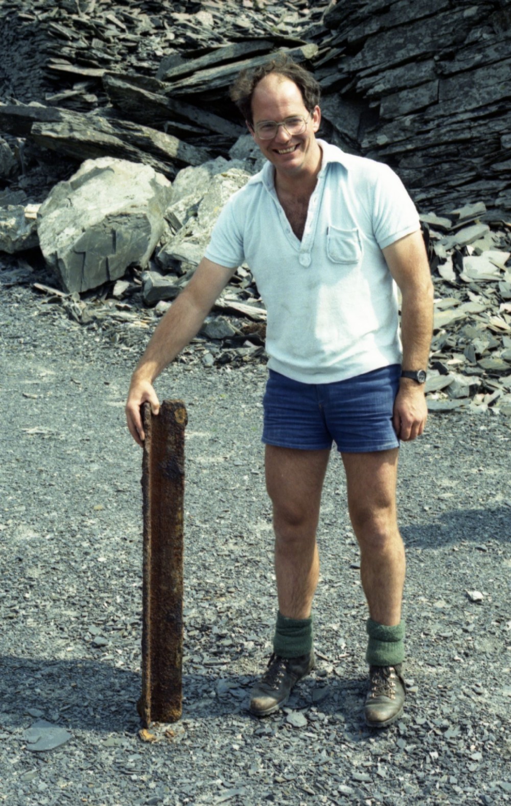 The late Merfyn Williams proudly displays the great discovery of a plateway rail in Diffwys.