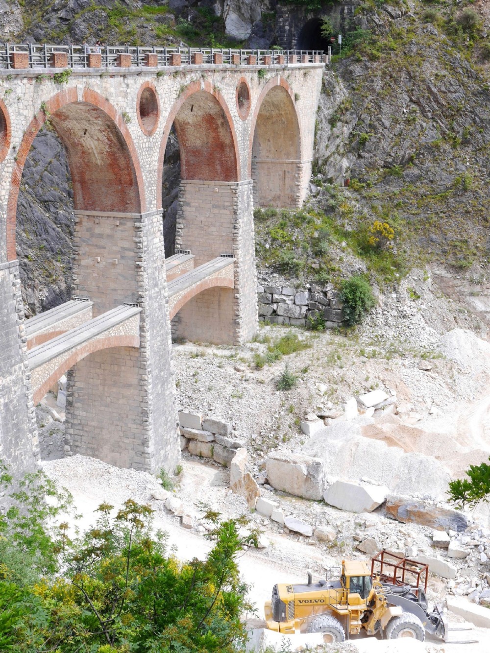 Closer view of the former railway bridge, with tunnel, now used by traffic, and marble-quarrying plant parked-up below