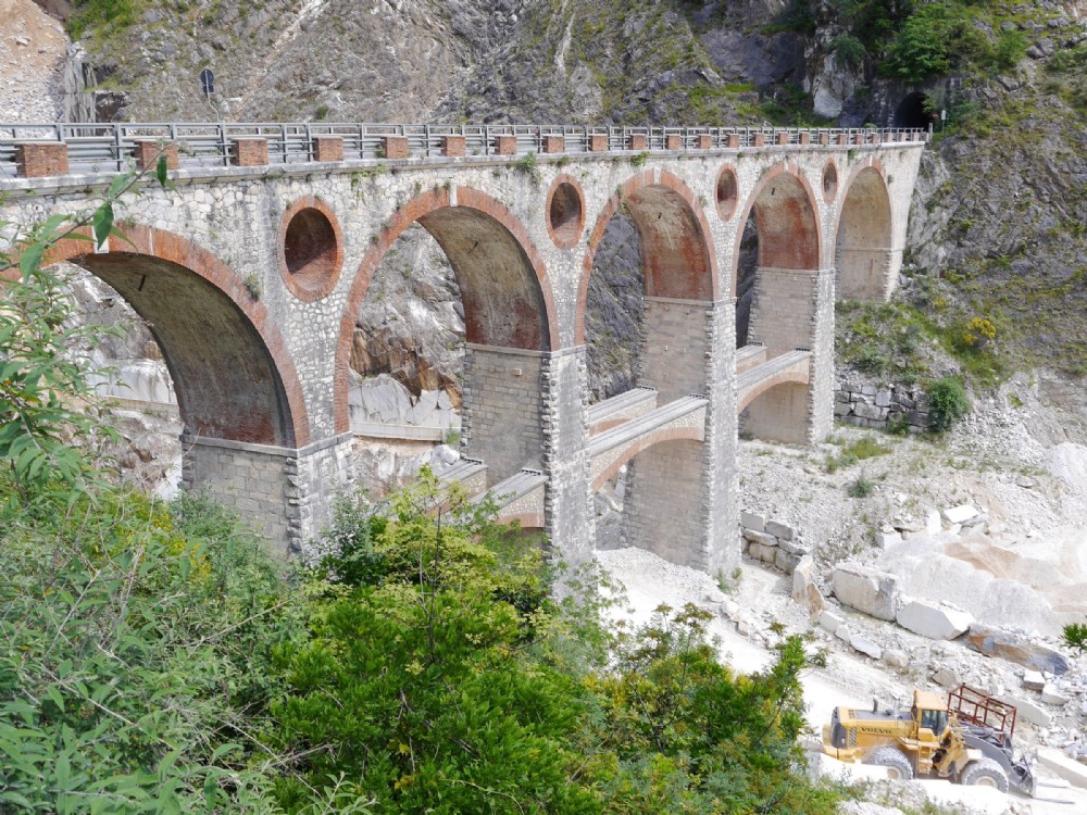 Former bridge for marble railway (Marmiferra), course of which now main tourist road, with stacking ground for marble blocks below