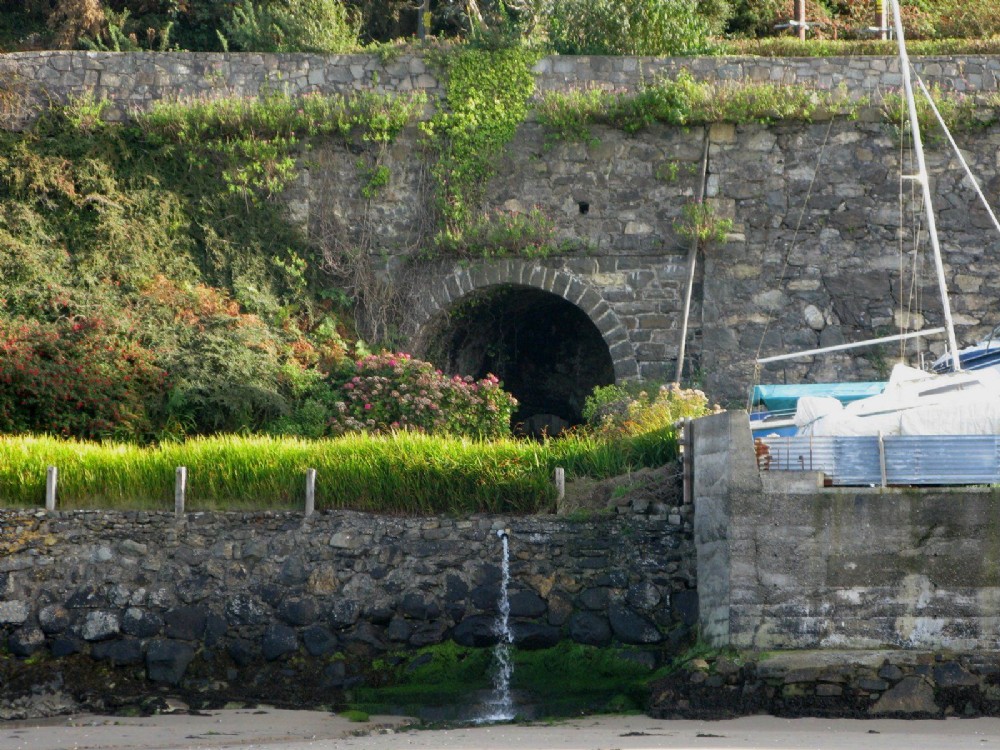 Water from the adit drains on to the beach. The St Tudwal's Iron Ore Company tramway ran along the top. 29/09/2012