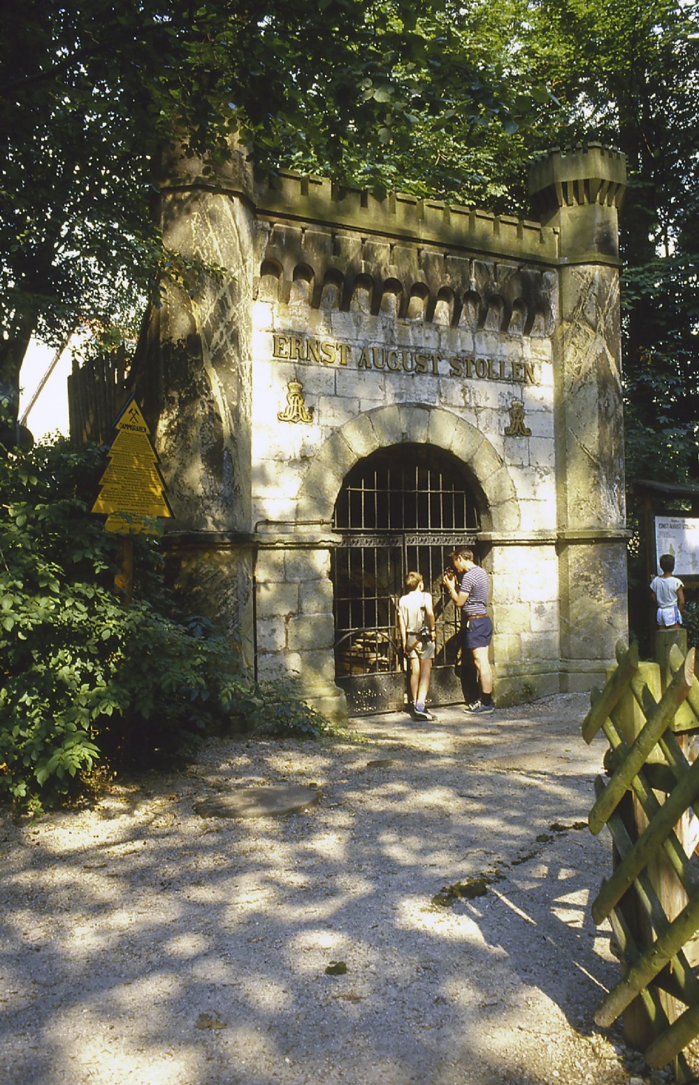 The Harz mining district around Clausthal, Germany has been remarkable for its silver/lead deposits from early times. The area has high rainfall and in the 16th Century adit tunnels were being driven into the steep valley sides for access and drainage. By the 1750s all the ground laid open by these had been largely worked out and a deep adit (known as George III Deep) was driven from 1777-1799. This was more than 6.5 miles in length. However, by 1851 deeper drainage was needed and a start was made on the Ernst August Stollen (Stollen= adit) which was made navigable for boating out ores. It was completed in 1867, was 14 miles long, had used 100 tons of gunpowder and an incalculable amount of hand labour in drilling. Ultimately, an even deeper water level was driven, but did not reach the surface. The portal of the Ernst August Stollen is a fine castellated affair of typical Teutonic grandeur.