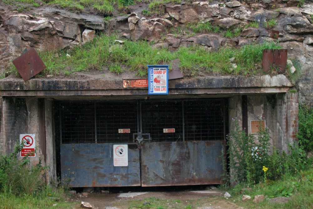 The mine entrance in the bottom of the quarry. Behind the gates is a block wall.
