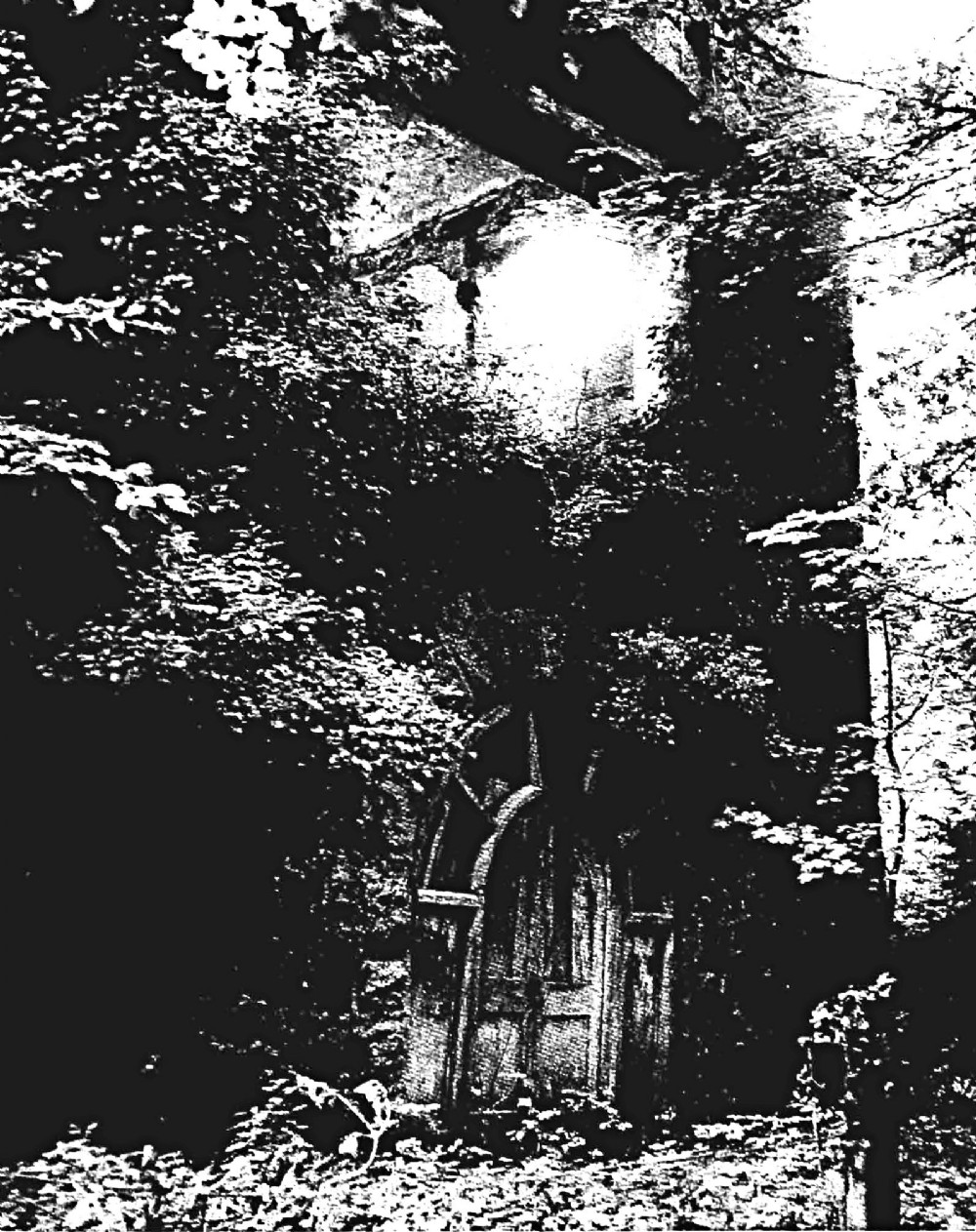 The engine house of Porter's 70 at Wheal Exmouth and Adams near Christow nearly obscured by trees and ivy. This photograph, taken by John Wellington probably around 1970, shows the rear of the house beside the road. Note the cylinder door and window joinery put back in position after removal of the engine in 1862.