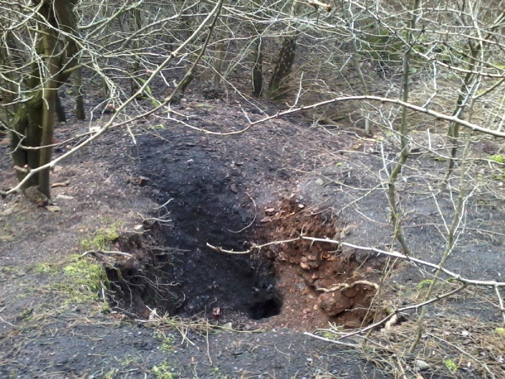 There are a number of pit falls it the densely wooded area, including bits of Iron sticking up from the ground. This one looks to have had recent activity with someone digging.
