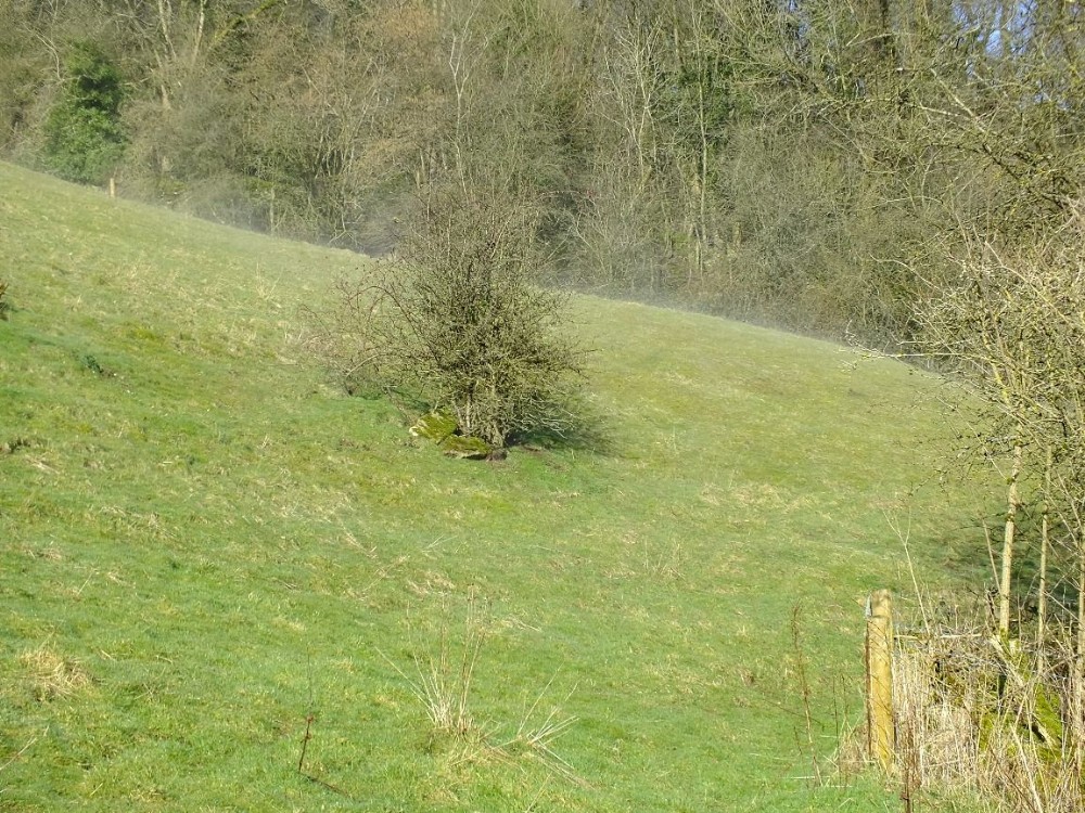 There are some stone slabs next to the tree which look like a shaft or well top, although it is very close to the sough tail which is just of the right side of the photo.
