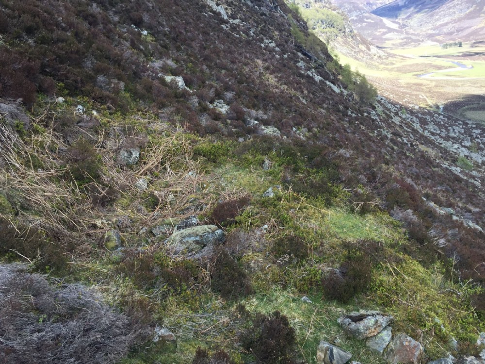 The only potential sign of workings was this hollow on a stabilised scree slope. Extensive investigation of cliffs above show no sign of workings or mineralisation.
