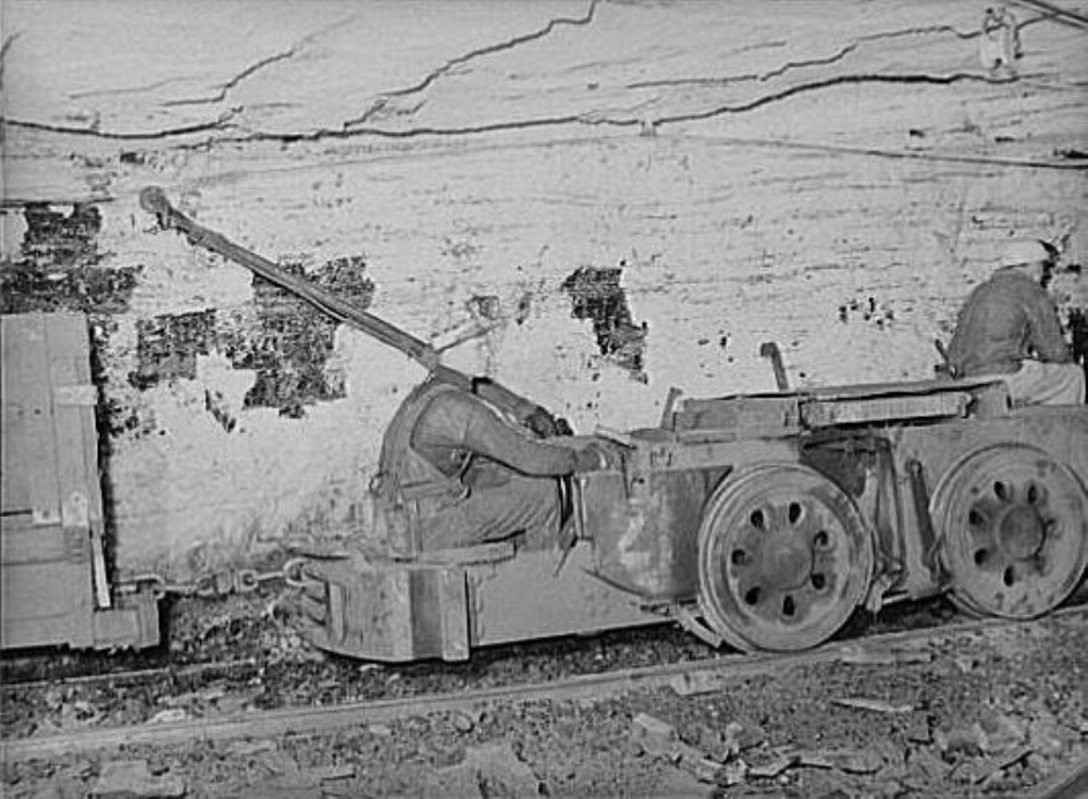Powerful electric locomotives pull up to thirty cars loaded with coal through the entries of the mine.