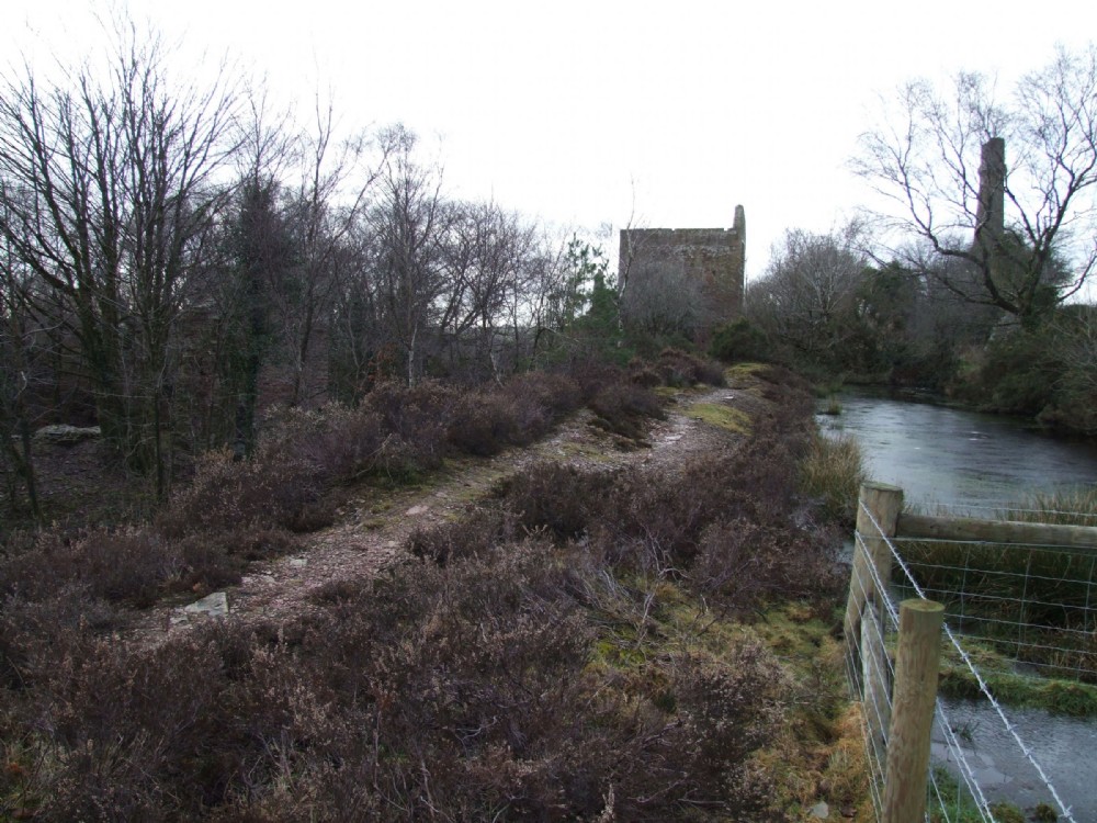 Watsons Engine House center Whim Engine House in the trees on the left, Stack for Watsons with the Miners Dry on the right, The stack of the stamps Engine House can be seen just to the left of Watsons, Engine Reservoir pond in forground. 01-02-10.