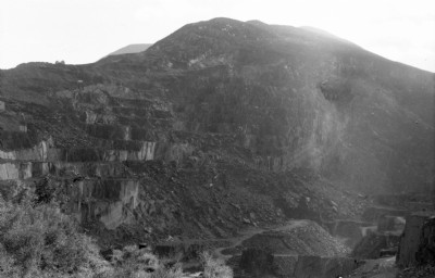 A general view of the east end of the quarry with Bethesda in the far distance. Again the tip in front of the mills when this picture was taken now entirely surrounds the Princess May balance and extends to the enge of the open pit.