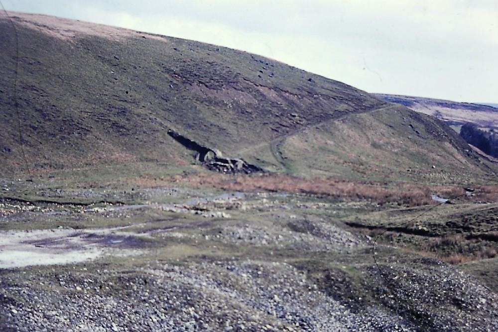 Taken from Cockhill Mill showing structure above the mill with trackway running under the arch, RT Clough has a photo of the mill with the flue running up the hill side (Lead Smelt Mills of the Yorkshire Dales p 69)