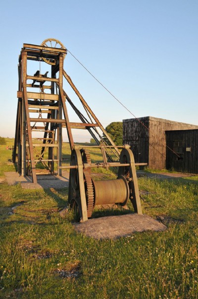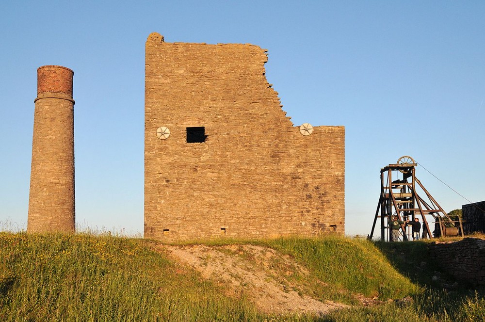 The Cornish pumping engine house, chimney and steel headframe at Magpie.