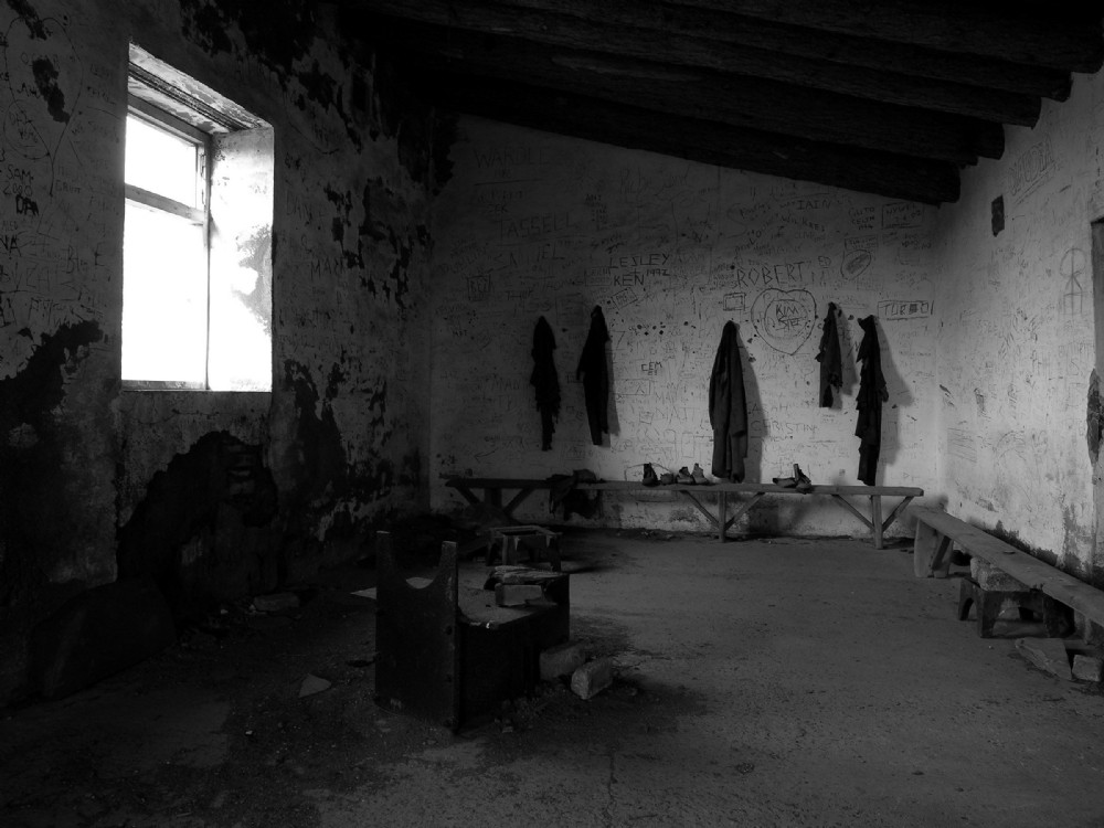 Ravaged by time, but largely intact, quarrymen's coats and boots are still present in this builing.