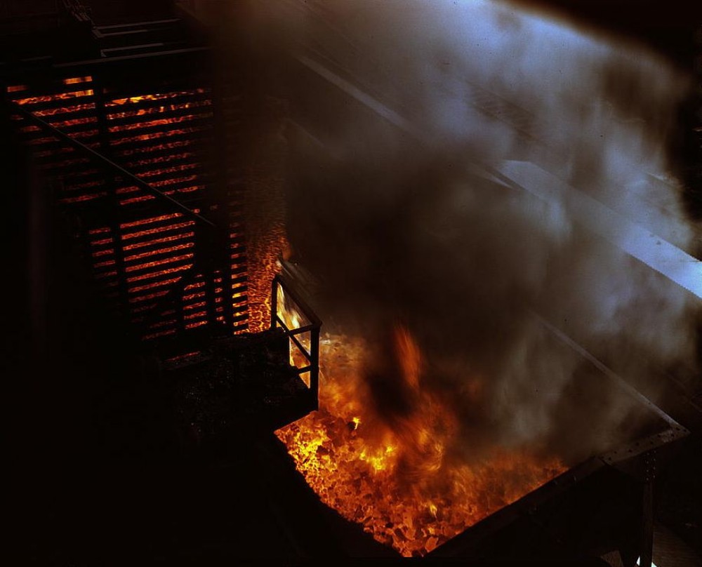 Coke being pushed into a quenching car, Hanna furnaces of the Great Lakes Steel Corporation, Detroit, Mich.